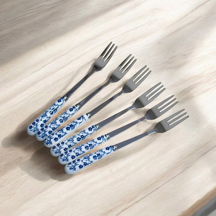 چنگال دسرخوری گل آبی با ظاهری شیک و مقاوم، طراحی ارگونومیک برای سرو راحت شیرینی و دسرها. جلوه لوکس روی میز شما را تضمین میکند. انتخابی ایدهآل برای پذیرایی خانگی و مهمانیهای خاص.
