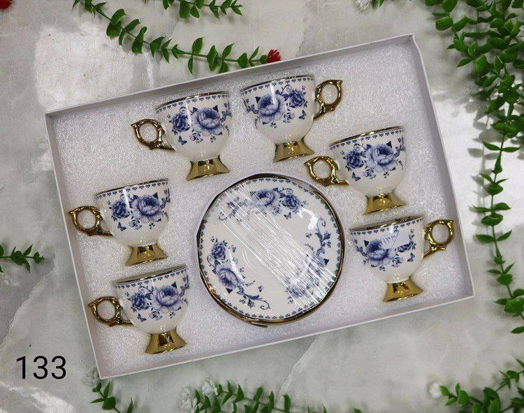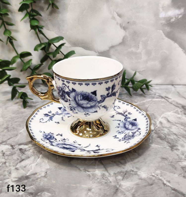 ظرافت در کنار درخشش طلایی، ویژگی اصلی این سرویس قهوهخوری گلدار است. نقش گلهای کلاسیک در کنار حاشیه طلایی براق روی لبه و دسته، پایه های تمام طلایی، جلوهای اشرافی و خاص ایجاد کرده که نگاه هر بینندهای را جذب میکند.