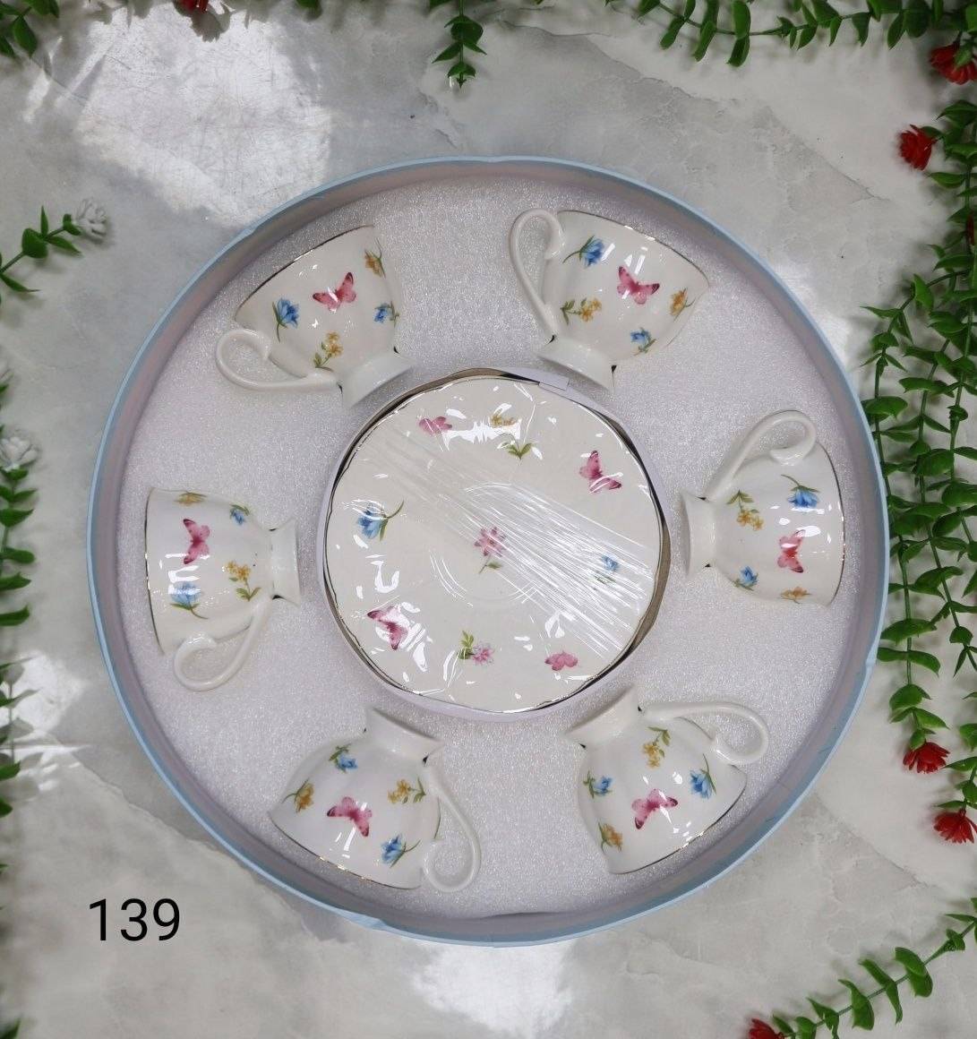 هر فنجان این مجموعه با طرحهای گل و پروانه متفاوت و هارمونی رنگی دقیق تزئین شده تا در کنار لبه های طلایی براق چشم هر بینندهای را برباید.