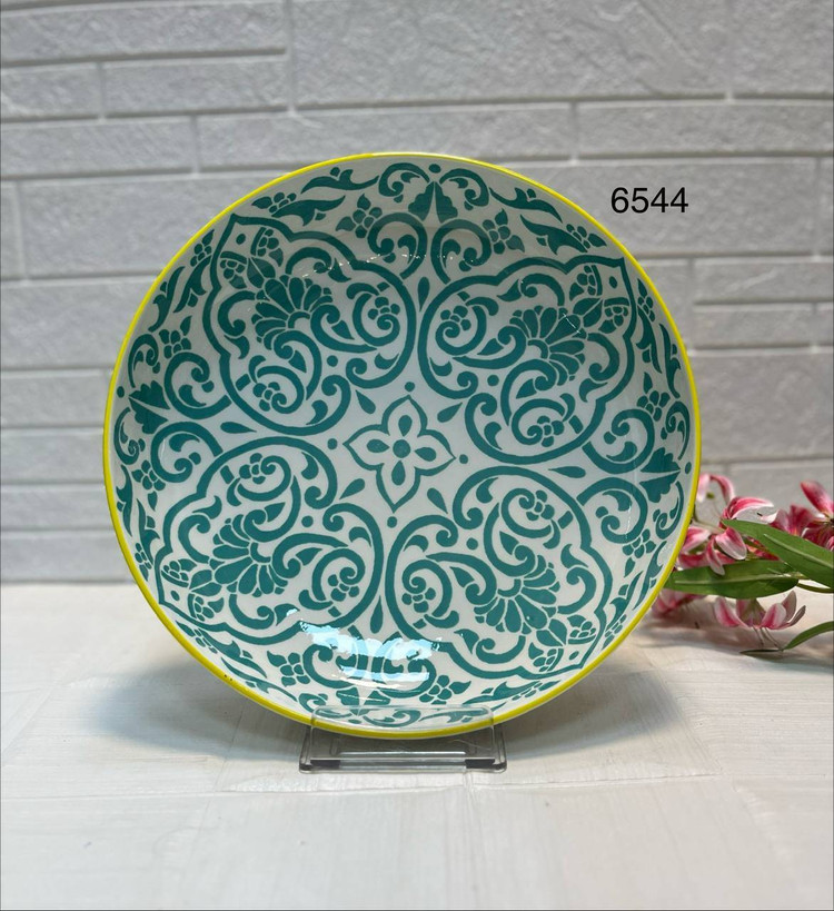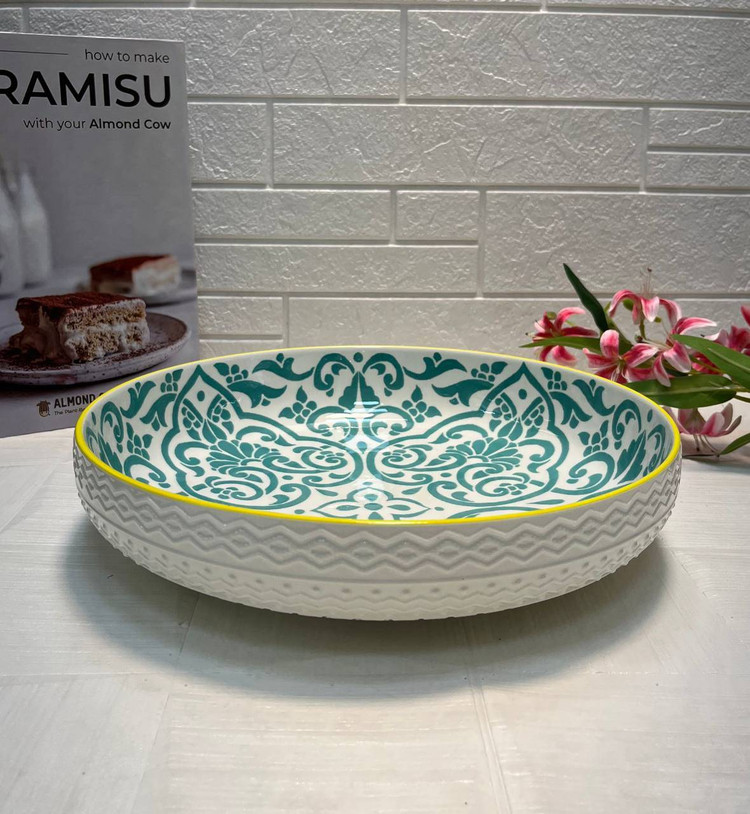 این دیس گود بزرگ دنیهوم ترکیبی جسورانه از اصالت و مدرنیته است. طراحی داخلی با نقشونگار سنتی به رنگ سبز فیروزهای، حس کاشیکاریهای ایرانی را زنده میکند؛ در حالی که لبه زرد ظریف آن، یک کنتراست متفاوت و چشمگیر ایجاد کرده که محصول را کاملاً متمایز میکند.