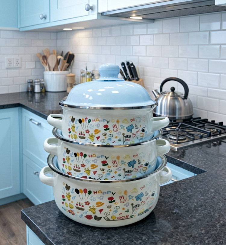 این قابلمه لعابی که شامل ۳ قابلمه به سایزهای ۱۶ سانت، ۱۸ سانت و ۲۰ سانت و ۳ درب قابلمه که مجموعاً ۶ پارچه میشود، با طراحی فانتزی و لعاب باکیفیت و مقاوم بهترین انتخاب برای خانه، هدیه و جهیزیه میباشد.